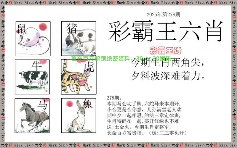 278期:正版彩霸王:今期生肖两角尖,夕料波深难着力。 看生肖:今期送凶丑开的生肖 七肖:蛇猪兔虎马龙牛 |
