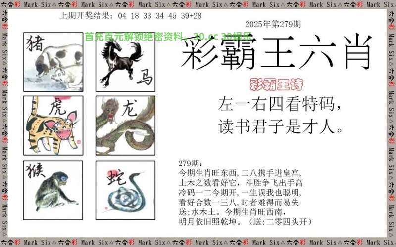 279期:正版彩霸王:左一右四看特码,读书君子是才人。 看生肖:今期送男肖开的生肖 七肖:狗猴鸡兔鼠马虎 |