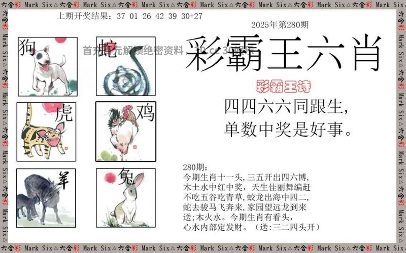 280期:正版彩霸王:四四六六同跟生,单数中奖是好事。 看生肖:今期送单数开的生肖 七肖:虎鸡羊鼠牛兔猴 |
