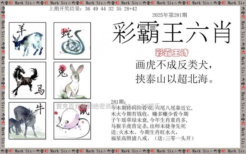 281期:正版彩霸王:画虎不成反类犬,挟泰山以超北海。 看生肖:今期送凶丑开的生肖 七肖:虎龙鸡羊鼠蛇兔 |